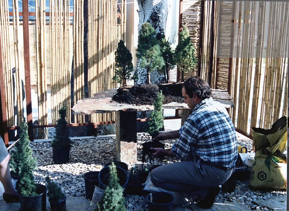 Este bosque lo conocía por la foto publicada en el libro de su autor: Saburo Kato, maestro y director de la Nippon Bonsai Association. Se trata de una especie de difícil cultivo y para mi desconocida. Planteo a Felipe la necesidad de adecuar un espacio en los jardines para el bosque. Recibo el encargo para diseñar y construir una pérgola, umbráculo, invernadero y taller.