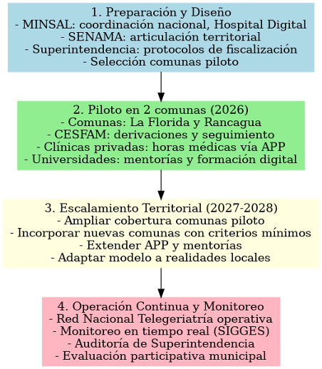 - Fase de escalamiento territorial (2027-2028): en caso de que los resultados del piloto sean positivos, se contempla una expansión gradual a nuevas comunas, priorizando aquellas con alta concentración de personas mayores y baja disponibilidad de atención especializada. El escalamiento será modular y flexible, permitiendo adaptar el diseño según la realidad territorial, disponibilidad de profesionales, infraestructura y redes locales. Esta fase incluirá: