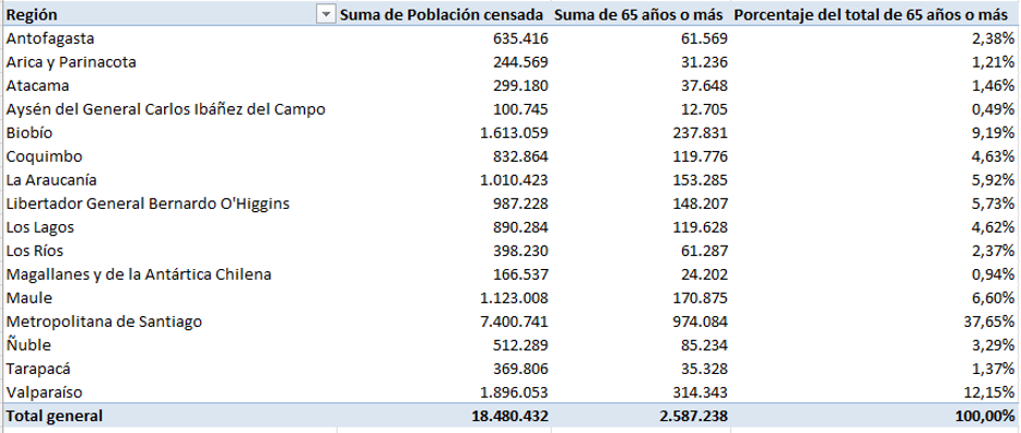 La distribución territorial del envejecimiento refuerza la idea de que el modelo vigente no resulta ser suficiente por sí mismo. En el margen del año 2024, los resultados arrojados por el Censo mostraron que en Chile habitan alrededor de 2.587.238 personas de 65 años o más. Si bien la Región Metropolitana concentra 974.084 personas mayores (37,65%), el 62,35% vive fuera de la misma. Existen siete regiones –excluyendo la Región Metropolitana– que superan las 100.000 personas mayores: Valparaíso (314.343), Biobío (237.831), Maule (170.875), La Araucanía (153.285), O’Higgins (148.207), Coquimbo (119.776), Los Lagos (119.628). En conjunto, las siete regiones señaladas reúnen 1.263.945 personas mayores (48,85% del total nacional). La distribución demográfica –frente a la concentración del 72% de geriatras ejerciendo en la Región Metropolitana– dificulta sostener los mecanismos de respuesta al envejecimiento, especialmente si estos operan con dispositivos presenciales y con escasez de profesionales. La expansión en la cobertura requiere descentralización y planificaciones que ayuden a combatir el déficit de geriatras en el país.